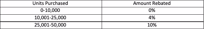 You might think that if retrospective business rebates exist, then non-retrospective rebates must exist, too, and you’d be right. If you implement a non-retrospective business rebate program, your partner doesn’t receive any rebates on units 1–10,000 but does receive rebates on all units purchased after that—at least until they reach their next threshold. This means that units 10,001–25,000 will receive a 4% rebate and units 25,001–50,000 receive a 10% rebate.